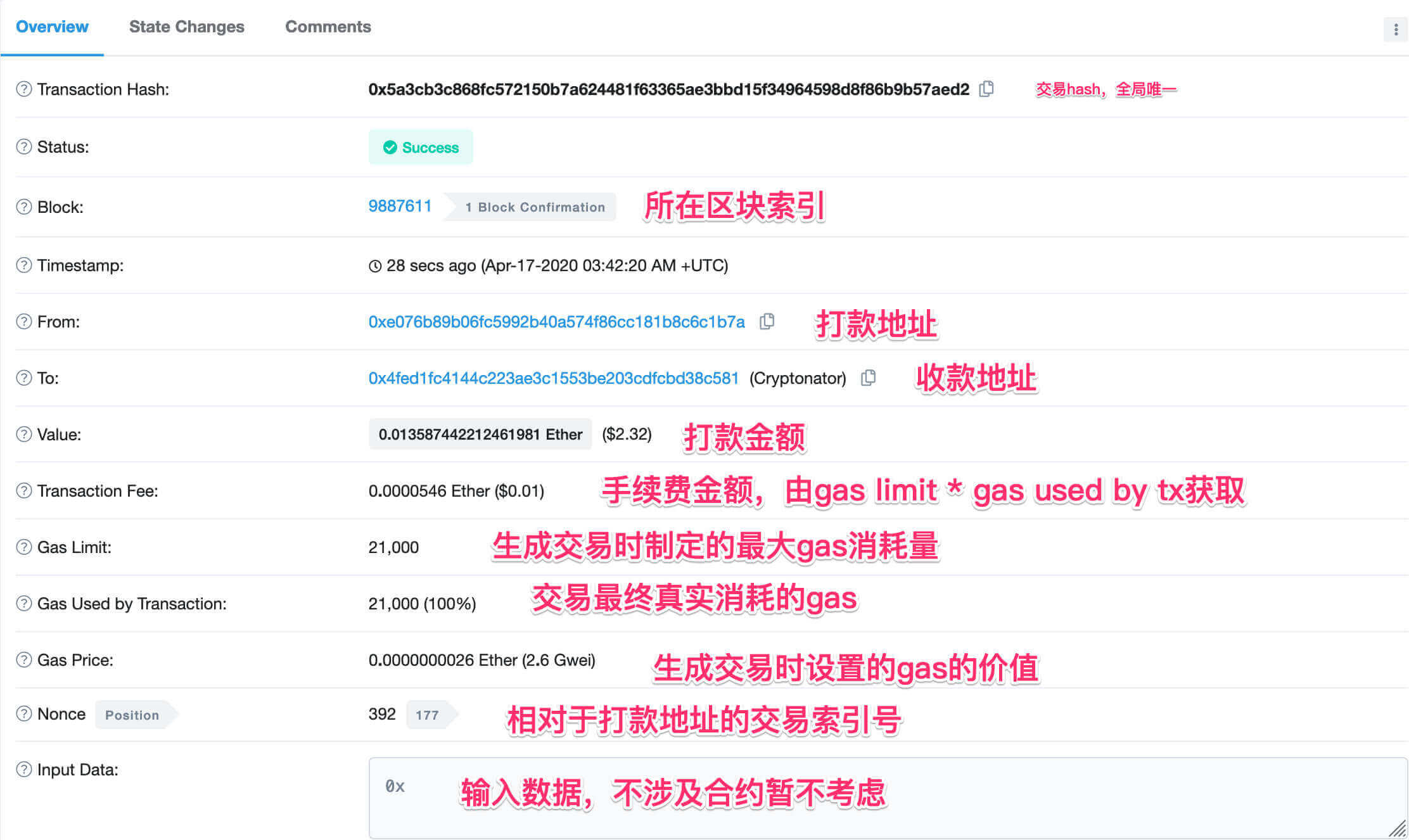 以截图中的交易为例,Gas为21000,Gas Price为2.6Gwei
