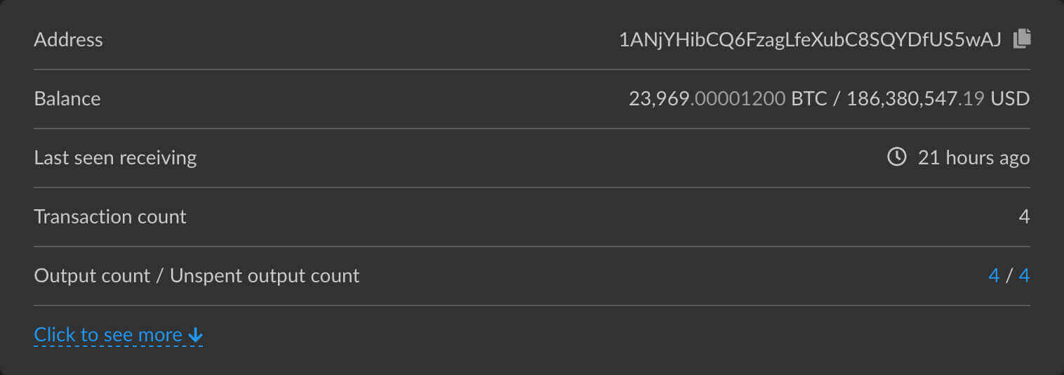 例如,我们查看地址1ANjYHibCQ6FzagLfeXubC8SQYDfUS5wAJ的余额为23,969.00001200 BTC。