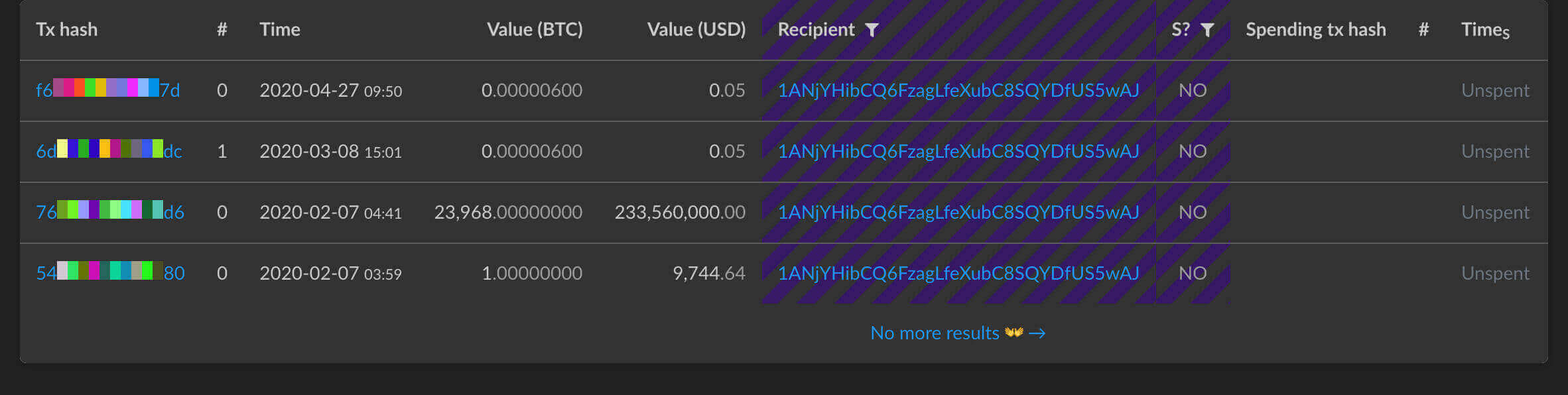 我们把这4个UXTO的金额0.00000600+0.00000600+23,968.00000000+1.00000000加起来便是23,969.00001200 BTC。
