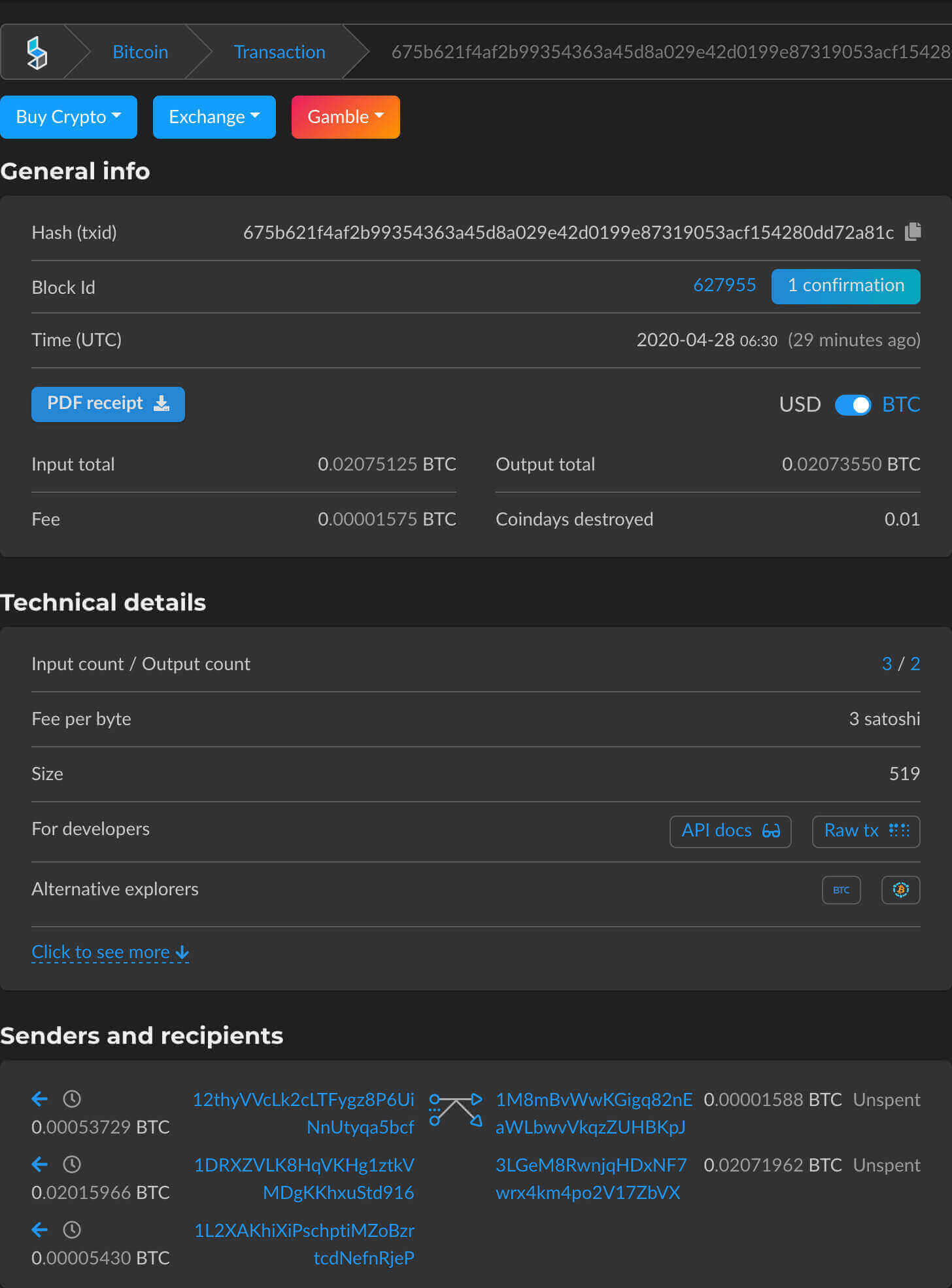 比特币的交易信息我们可以从区块链浏览器blockchair上查看。