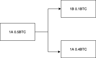 所以我们需要注意一种情况,比如我们有一个地址1A的UXTO金额为0.5BTC,我们想给地址1B打0.1个BTC。那么在不考虑手续费的情况下,我们则需要构造这样一个交易,注意,程序是不会自动帮我们创建找零输出的